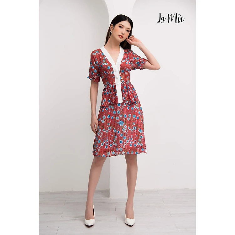 Đầm Voan Nữ Cổ Viền, Họa Tiết Hoa Đỏ Cổ Điển Maxivic, La Mộc - LM82107