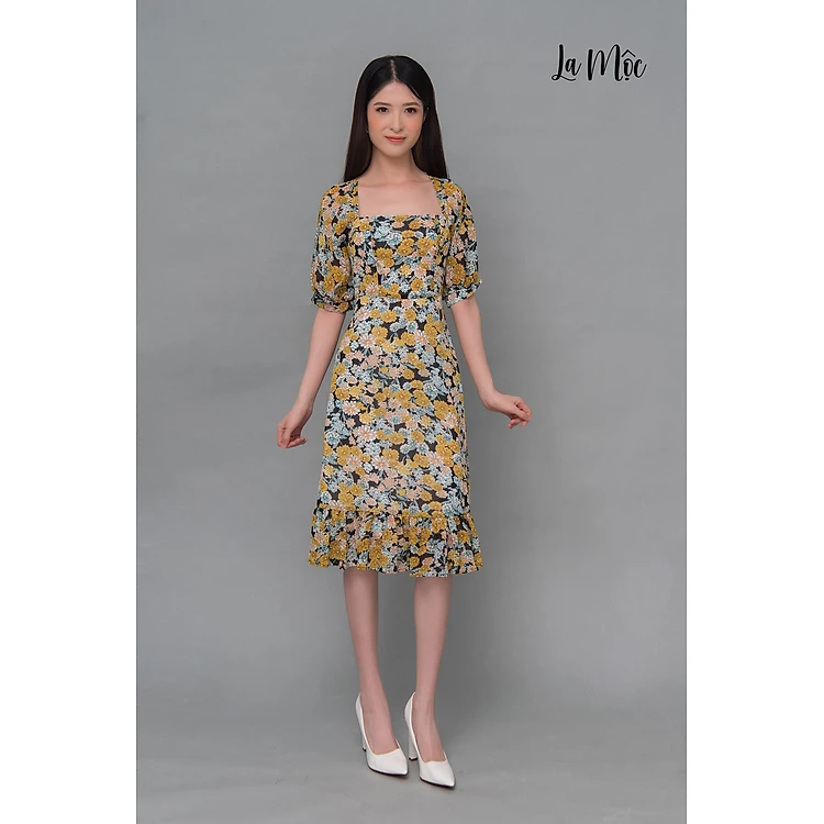 Đầm Voan Nữ Cổ Vuông, Họa Tiết Hoa Vàng Cổ Điển Maxivic, La Mộc LM62122