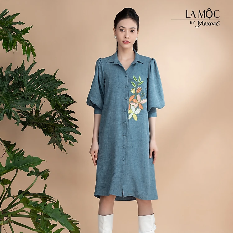 Đầm xô lụa sơmi xanh jeans thêu La Mộc LM022425