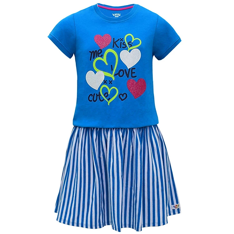 Đầm được in hình trái tim thật dễ thương cùng những dòng chữ “Kiss me, love, cute” thật bắt mắt. Form đầm xòe, tay ngắn nên rất thoải mái khi mặc. Phần tà trang trí họa tiết sọc dọc đầy thu hút. Đầm có màu xanh biển tươi tắn mang đến dáng vẻ khỏe khoắn, mới mẻ cho bé.