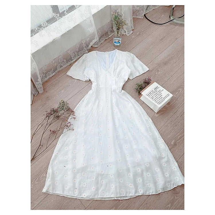 (ảnh thật) Đầm Xòe Cổ V Hoa Cúc Tay Cánh Tiên