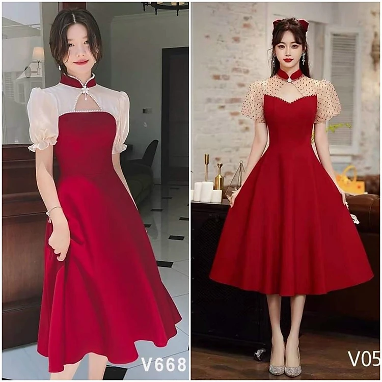 Đầm xoè đỏ tiểu thư cổ khoét ngực kèm phụ kiện ( có mút )