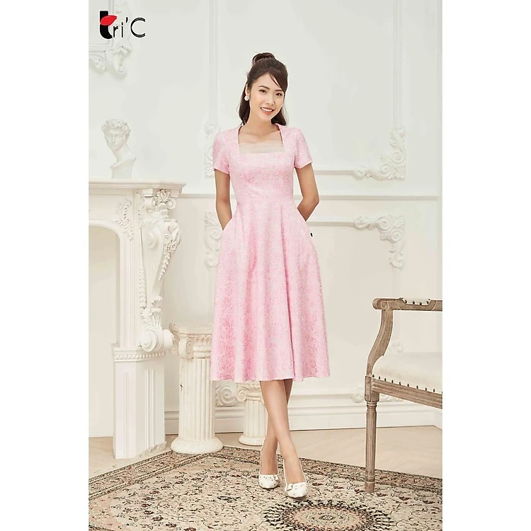 Đầm xòe gấm lụa hoa, cổ lưới vuông Tri'C Luxury L020521 Hồng