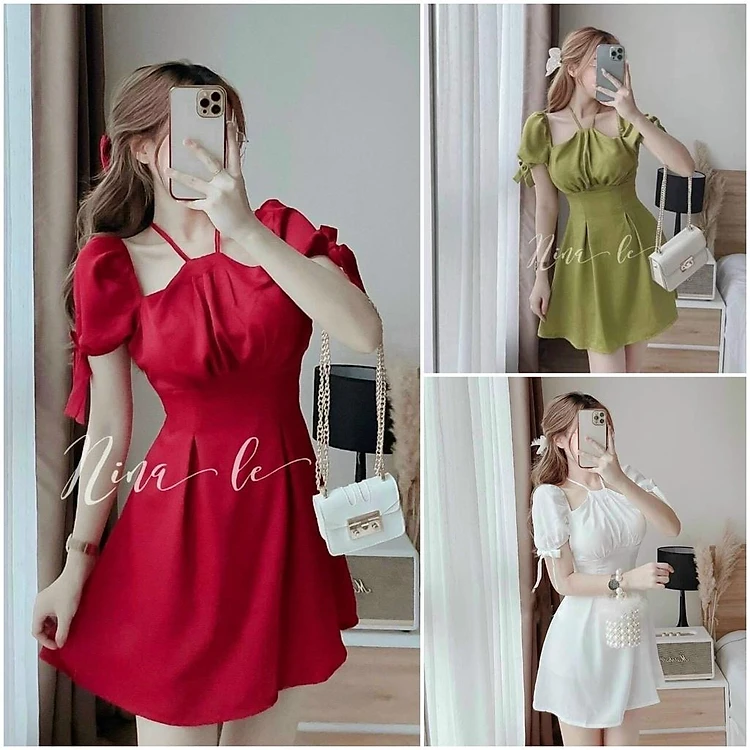 Đầm xoè tiểu thư cổ yếm tay nơ xinh xắn ( kèm mút )
