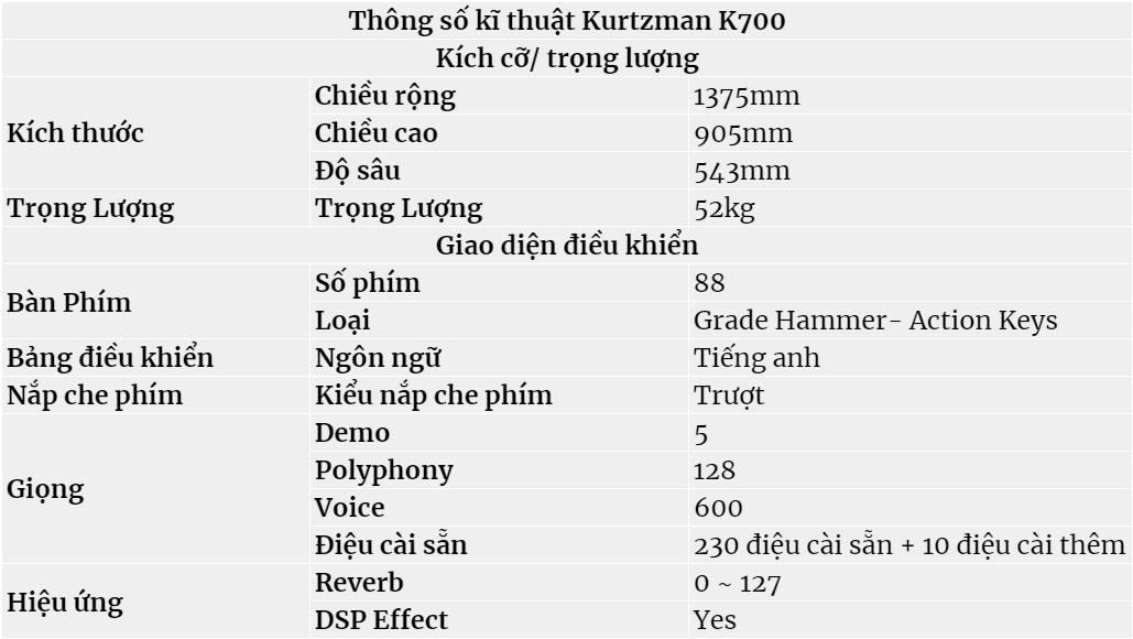 Đàn Piano điện Kurtzman K700 được tích hợp điệu 600 voices phong phú (Piano, Guitar, Violin, String, T) và 230 điệu đệm được cài sẵn (Rock, Pop Ballad, Country, 8Beat,). Nhờ vậy, bạn có thể thỏa sức sáng tạo theo phong cách độc đáo của riêng mình. Chức năng đệm điệu nhạc cho phép bạn lựa chọn một điệu bất kỳ, sau đó máy sẽ đệm theo hợp âm mà bạn chơi trên đàn. Chức năng này có trong một số đàn Organ thông dụng hiện nay, nay đã xuất hiện trên đàn piano điện Kurtzman K700. Giờ đây bạn vừa có thể luyện piano vừa có thể luyện Organ cùng 1 lúc!