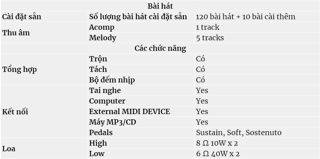 Ngoài ra, sản phẩm có 120 bài hát được cài sẵn giúp bạn thư giãn sau những giờ luyện tập. Đây là các bài hát kinh điển nổi tiếng trong thế giới âm nhạc.