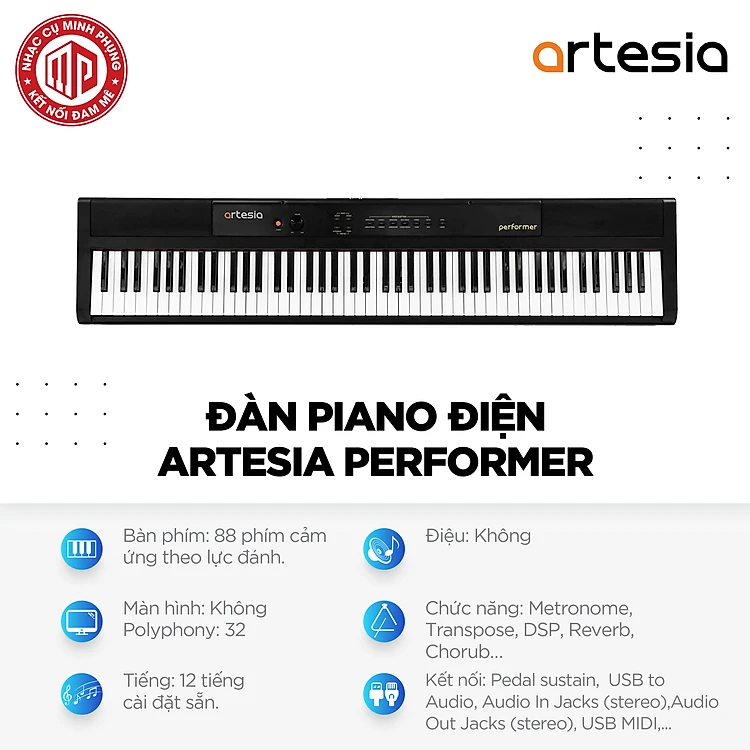 Artersia Performer là một trong những sản phẩm thuộc phân khúc tầm trung của thương hiệu Artesia (Mỹ) dành cho người chơi ở mọi trình độ từ mới bắt đầu học cho đến nhạc sĩ chuyên nghiệp. Với mức giá chỉ hơn 5 triệu đồng nhưng Artesia Performer sở hữu âm thanh chất lượng cao và đầy đủ các chức năng hỗ trợ mạnh mẽ cho việc luyện tập và biểu diễn. Bên cạnh đó, Đàn Piano Điện Artesia Performer được thiết kế đẹp mắt, thanh lịch và gọn nhẹ, hoàn hảo cho việc di chuyển. Giờ đây bạn có thể tận hưởng âm nhạc không giới hạn ở bất cứ nơi đâu bạn thích: ở nhà, ở trường học, đi picnic cùng bạn bè hay địa điểm biểu diễ