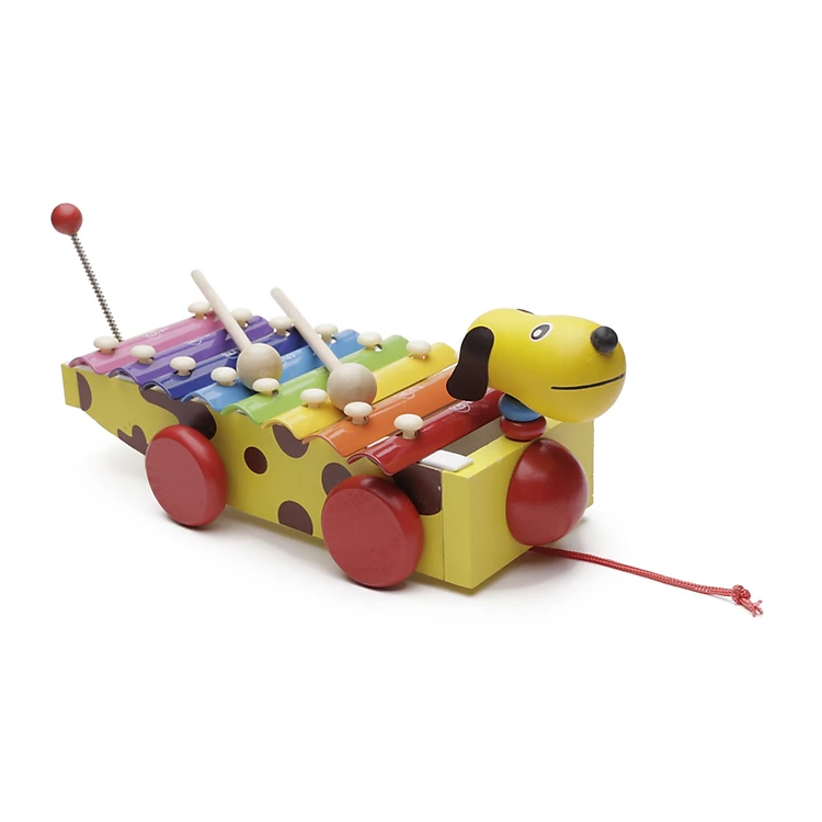 Thân đàn được thiết kế như một thùng xe với 4 bánh xe nhỏ bằng gỗ. Phía trên có gắn 8 thanh hợp kim nhẹ, khi gõ lên sẽ phát ra âm thanh như những nốt nhạc cơ bản. Phía trước là một khối gỗ được tạo hình thành một cái đầu chú chó đốm đáng yêu. Có dây nối để bé có thể kéo qua lại. Cùng với 2 que gõ bằng gỗ. Bộ đồ chơi Đàn xe kéo hình con chó là một sản phẩm được thiết kế tinh xảo, hoàn mỹ.