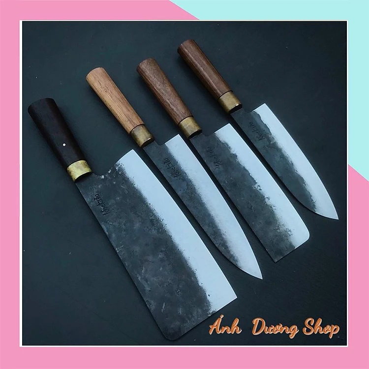 Dao bếp bộ 4 dao nhà bếp chất lượng cao làm 100% từ thép nhíp xe oto do nghệ nhân Học Kiều rèn thủ công 100%