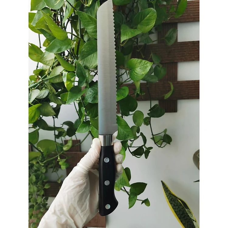 - Dao cắt bánh mì làm bằng chất liệu thép không gỉ có độ sắc gấp nhiều lần so với chất liệu thông thường cho vết cắt mịn.
