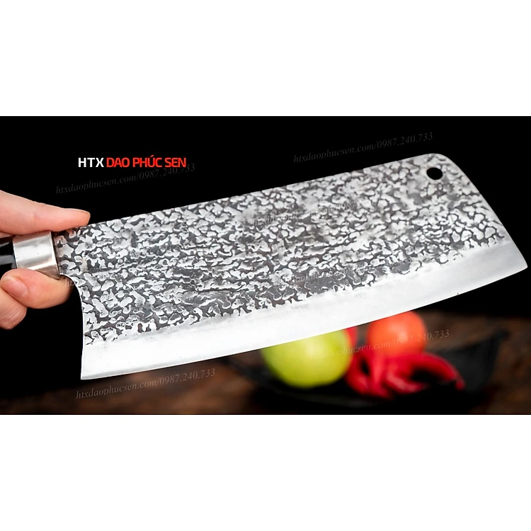 Dao chặt gà sắc bén - Thép nhíp ô tô - Cán mun khâu inox - N09TM Lựa chọn nguyên liệu 100% là nhíp ô tô ( Liên xô, Ifa ) được các thợ rèn giỏi gia công tỉ mỉ từ lưỡi dao cho đến cán dao đảm bảo việc băm chặt xương sắc - ngọt. Các sản phẩm của HTX Dao Phúc Sen thợ rèn đều sử dụng than củi khi nung thép cũng như tôi dao để đảm bảo lưỡi dao khi ra lò sắc bén và bền lâu. Nét đặc biệt của mẫu dao này là bề mặt lưỡi dao được thợ rèn giỏi của HTX Dao Phúc Sen đập rèn hoa văn tỉ mỉ đẹp mắt tạo nét khác biệt cho từng con dao và bề mặt hoa văn này còn có tác dụng chống dính bám thực phẩm khi chặt gà,vịt.
