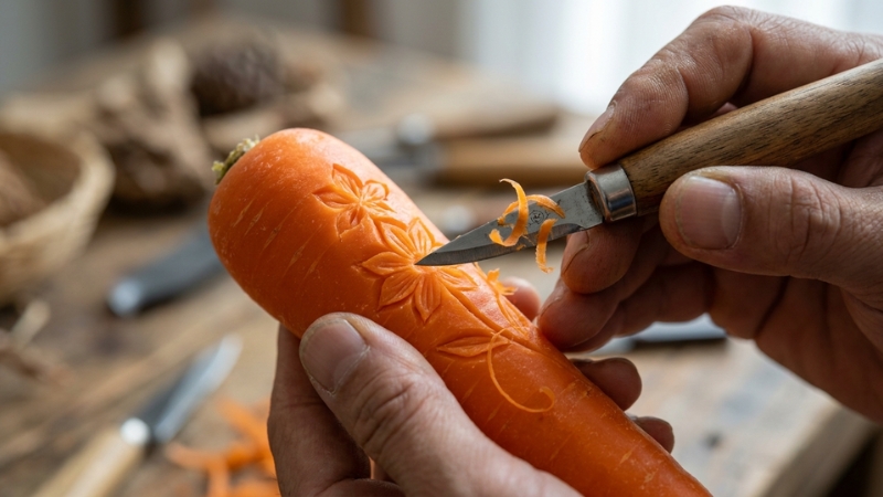 Sử dụng dao khắc chính hãng giúp thực hiện các đường tỉa hoa văn tinh xảo trên rau củ quả