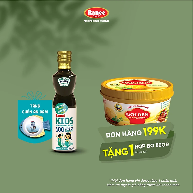 {Đơn 199k tặng hộp bơ 80g} [Tặng kèm chén ăn dặm hình cá] Dầu ăn dinh dưỡng cho trẻ Ranee KIDS 250ml + tặng kèm chén ăn dặm cao cấp hình cá