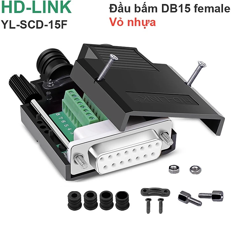 Đầu bấm cổng DB15 cái female bắt vít kèm vỏ ốp nhựa chân đồng HD-LINK YL-SCD-15F. HÀNG CHÍNH HÃNG