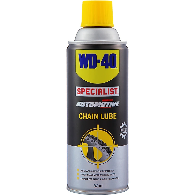 - Dầu Bảo Dưỡng Sên Chain Lube WD-40-360ml bôi trơn bảo dưỡng sên (xích) có độ bám dính cao, chống thấm nước, chống mài mòn đồng thời bảo vệ sên giúp sên vận hành êm và chống kêu ồn khi chạy.
