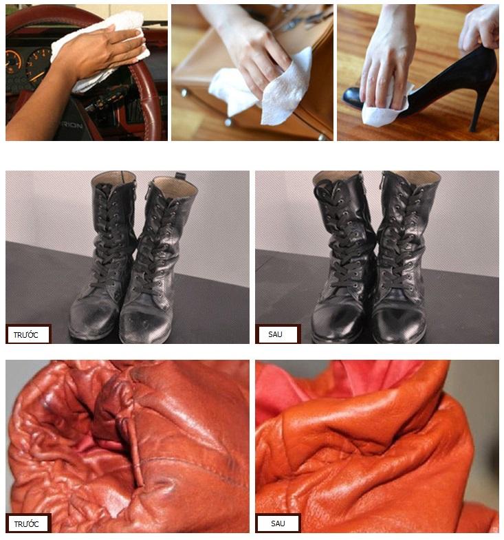 Sản phẩm không chỉ làm bóng thông thường,nó còn bổ xung độ ẩm,dưỡng chất giúp da bền bỉ hơn,mềm mại như hồi mới mua.Bên cạnh đó nó làm cho sản phẩm kháng,chống thấm nước tôt hơn đặc biệt khuyên dùng cho các loại áo da,bốt da,giầy da,sofa da,ghế da, đồ da ô tô