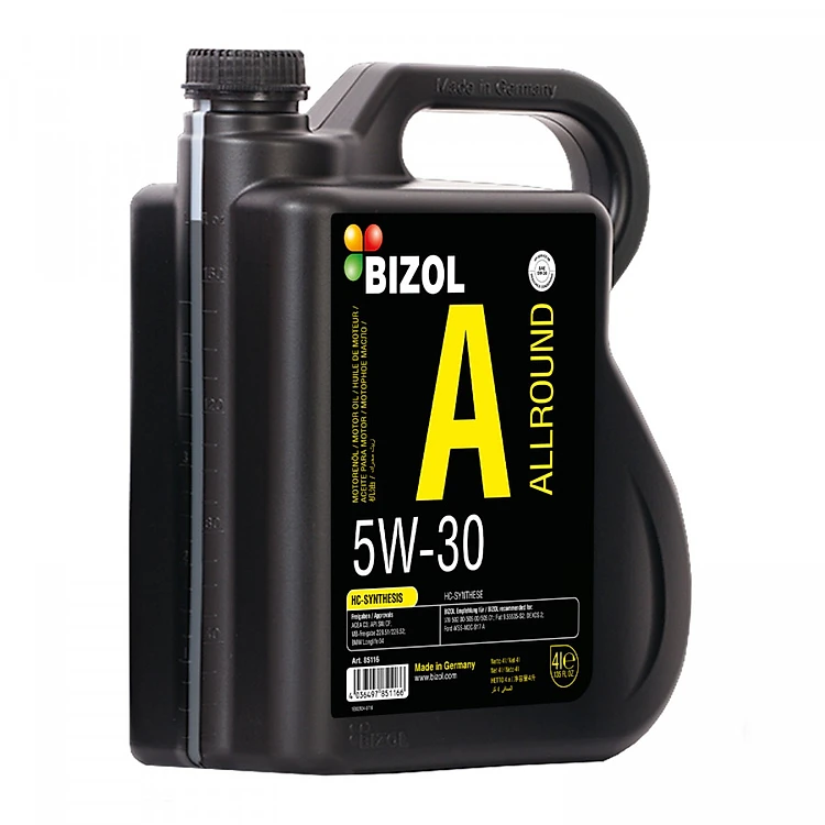 BIZOL Allround 5W-30 là loại dầu động cơ ma sát thấp, cao cấp, có chất lượng cao nhất, sử dụng quanh năm. Sự kết hợp dầu gốc độc đáo trên công nghệ tổng hợp HC với gói phụ gia mới nhất (công nghệ SAPS tầm trung) đảm bảo cho dầu có độ nhớt thấp và tính chống trượt ổn định cao. Sản phẩm ngăn cản tạo cặn các-bon hiệu quả, giảm ma sát và bảo vệ chống lại mài mòn tốt. Kết quả là tiết kiệm nhiên liệu và tuổi thọ động cơ kéo dài hơn. Sản phẩm này khuyên dùng cho động cơ xăng và diesel bao gồm turbo tăng áp và chuyển đổi xúc tác. Đặc biệt được khuyên dùng cho động cơ xăng có hệ thống TWC và động cơ diesel có hệ thống DPF.