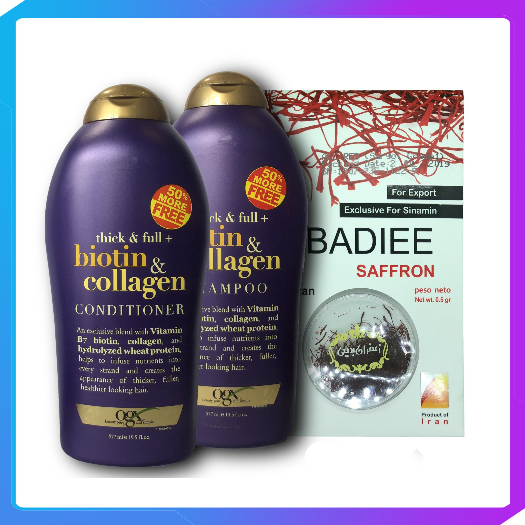 - Bộ đôi dầu gội và xả Ogx Biotin & Collagen có hợp chất ProVitamin B7 và biotin, tạo ra các chất dinh dưỡng thấm sâu, phục hồi từ bên trong sợi tóc.