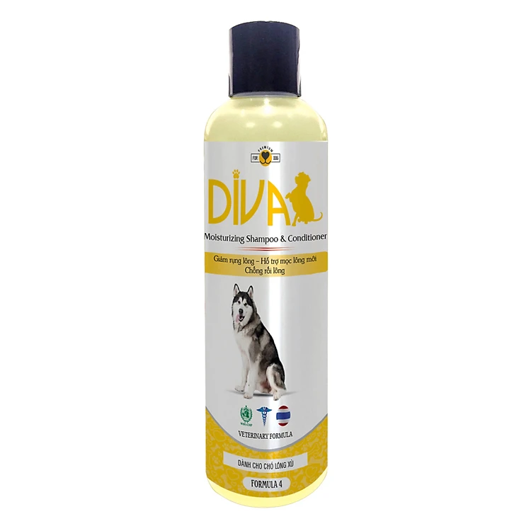 - Sữa tắm cho chó DIVA công thức 4 đặc biệt phù hợp cho các giống chó như Alaska, Husky, Samoyed, Becgie, Dùng được cho cả chó lông trắng và chó lông màu.