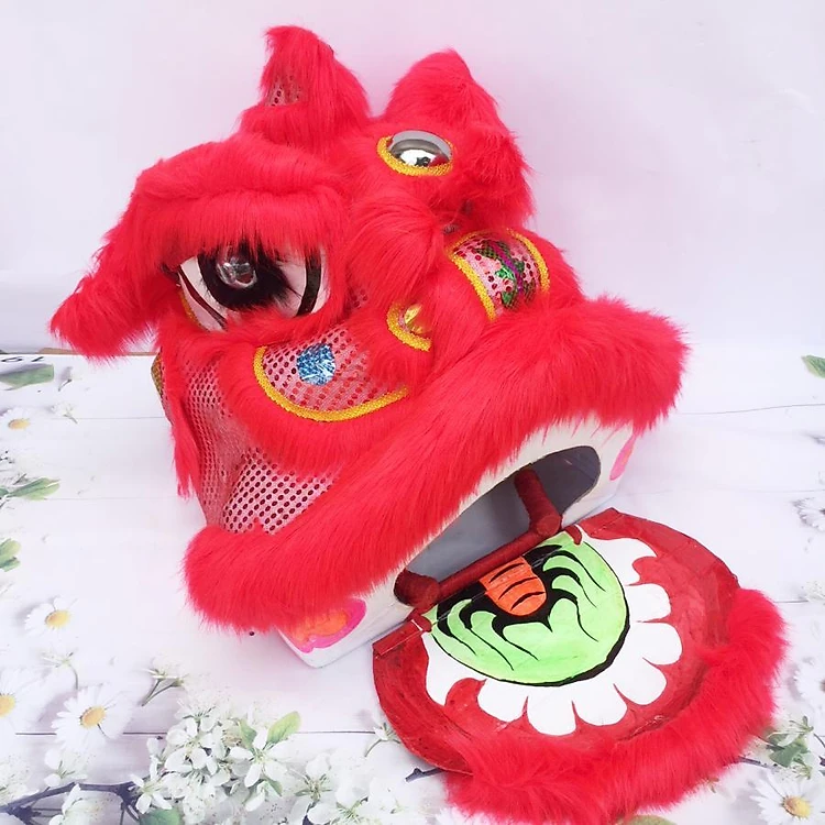 Đầu lân có đèn sáng ở mắt (lắp pin AA) , có dây điều khiển mắt chớp , tai vẫy.