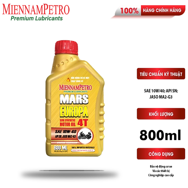 Dầu Nhớt MiennamPetro Mars Europa 4T 10W-40 API SN JASO MA2 1L Bảo Vệ Động Cơ Xe Máy 4 Thì Và Tiết Kiệm Nhiên Liệu