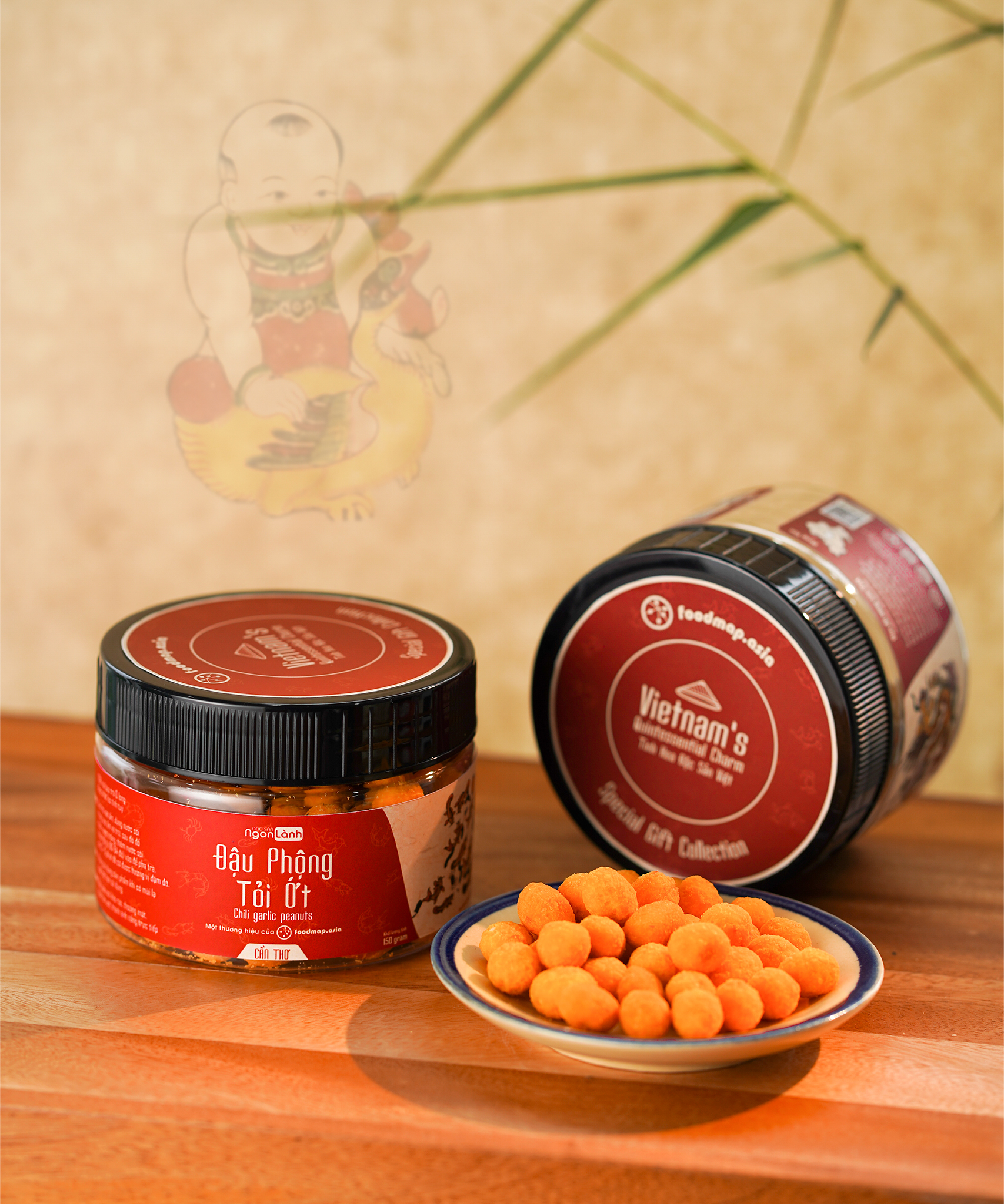 - Hương vị: Vị bùi béo, giòn thơm đặc trưng của đậu phộng Việt, xen lẫn vị mặn-ngọt-cay hòa quyện từ tỏi, ớt, đường và muối.