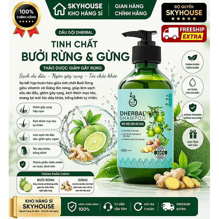 Dầu gội thảo dược tinh chất bưởi rừng gừng độc quyền DHERBAL chai 300ml giảm gãy rụng cải thiện mọc tóc chính hãng