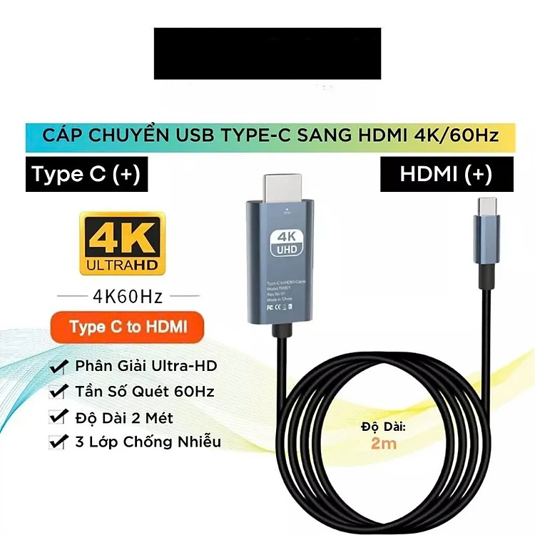 Dây Cáp Chuyển Đổi USB Type C To HDMI 4K 60Hz Dài 1.8M - Hàng Nhập Khẩu