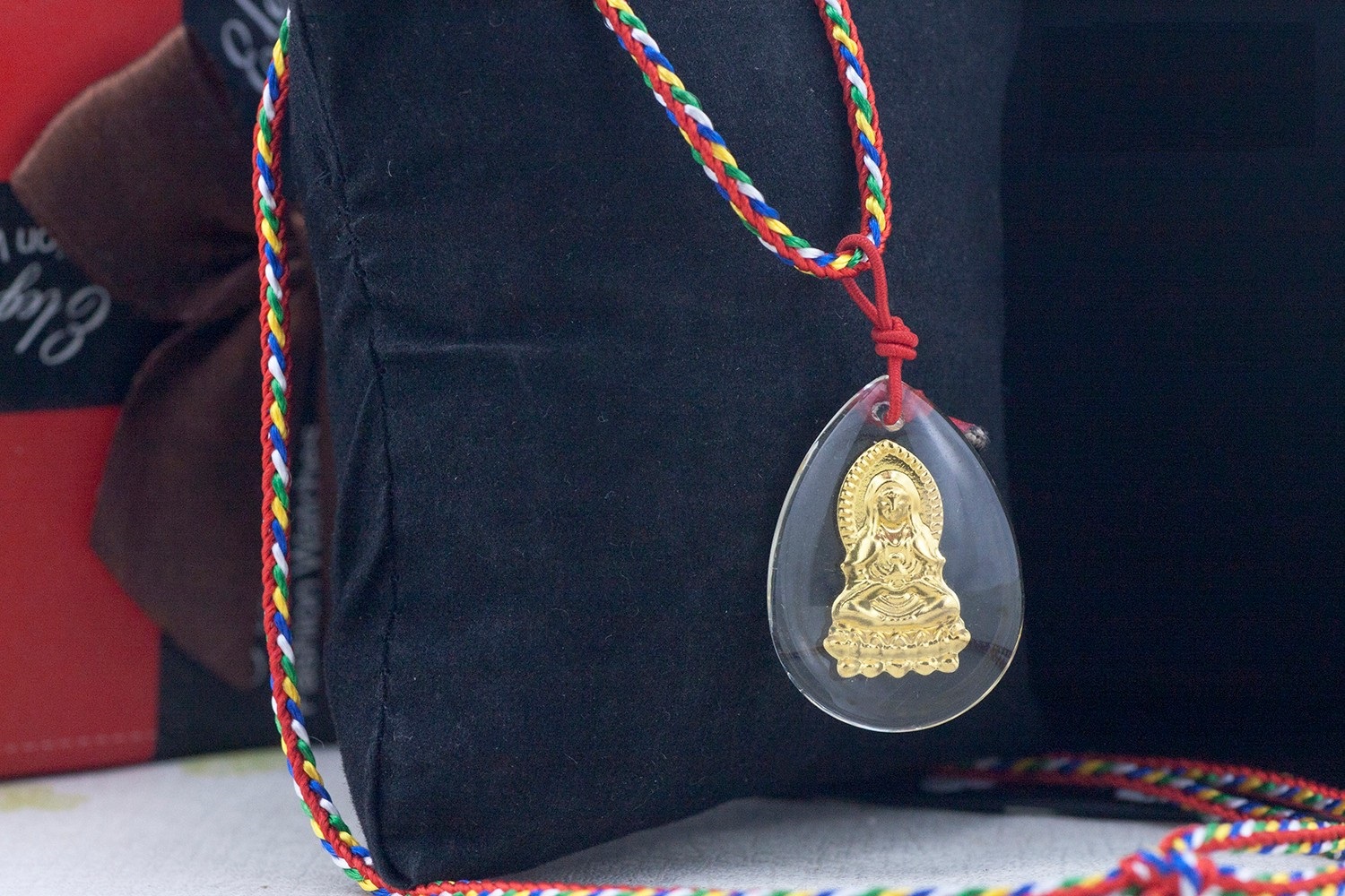 - Dây chuyền Phật Quan Âm giọt nước pha lê được thiết kế vô cùng độc đáo và sang trọng khi tượng Phật được chạm khắc tinh tế và tỉ mỉ trên pha lê trong suốt kiểu dáng giọt nước.