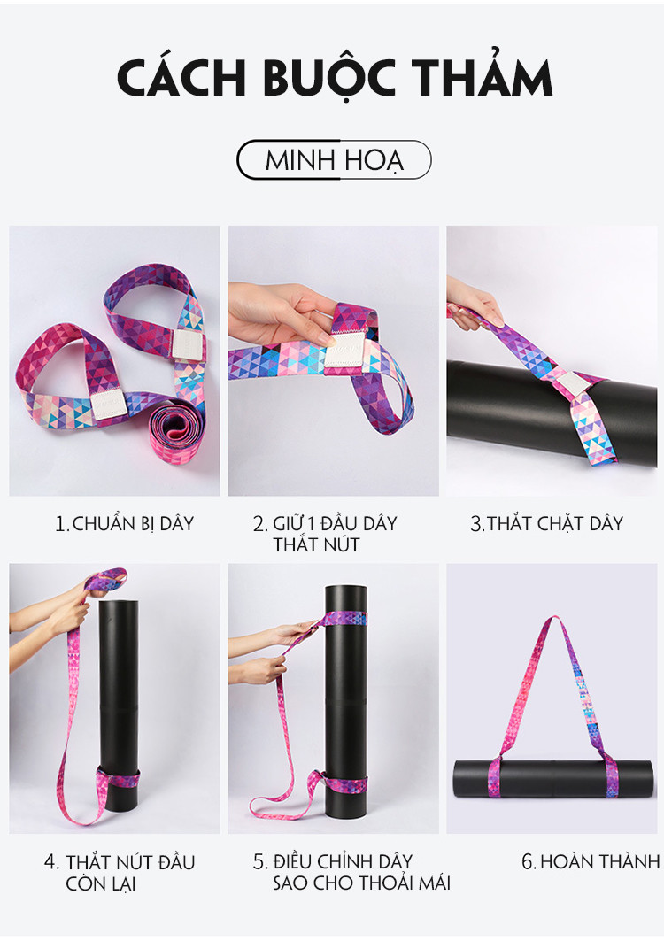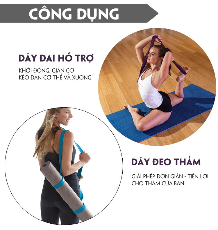 Dây buộc thảm đa năng : ngoài chức năng buộc thảm yoga mỗi khi sử dụng xong, dây đeo này còn có thể sử dụng trong các bài tập hỗ trợ yoga / sử dụng các bài tập căng cơ khác nhau, được ví như một sợi  hỗ trợ rất tuyệt vời.