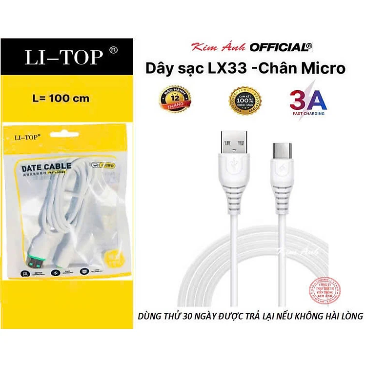 Dây sạc 3A LI-TOP LX33 chân Micro (Túi), dòng điện 5V-3A, Kim Ánh cho dùng thử 30 ngày, hàng chính hãng