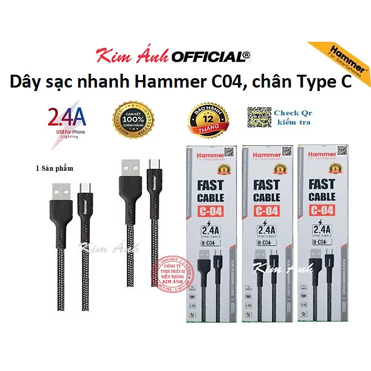 Dây sạc nhanh Ham mer C04 các loại chân cắm Type C, dòng điện 5v-2.4A, dây dù check Qr kiểm tra hàng chính hãng