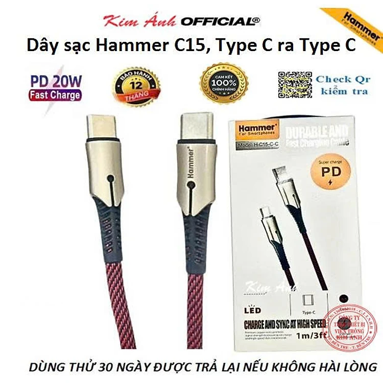 Dây sạc nhanh Ham.mer PD20W ( C15) chân cắm Type C ra Type C, dây dù chống rối, Hàng chính hãng bảo hành 1 năm