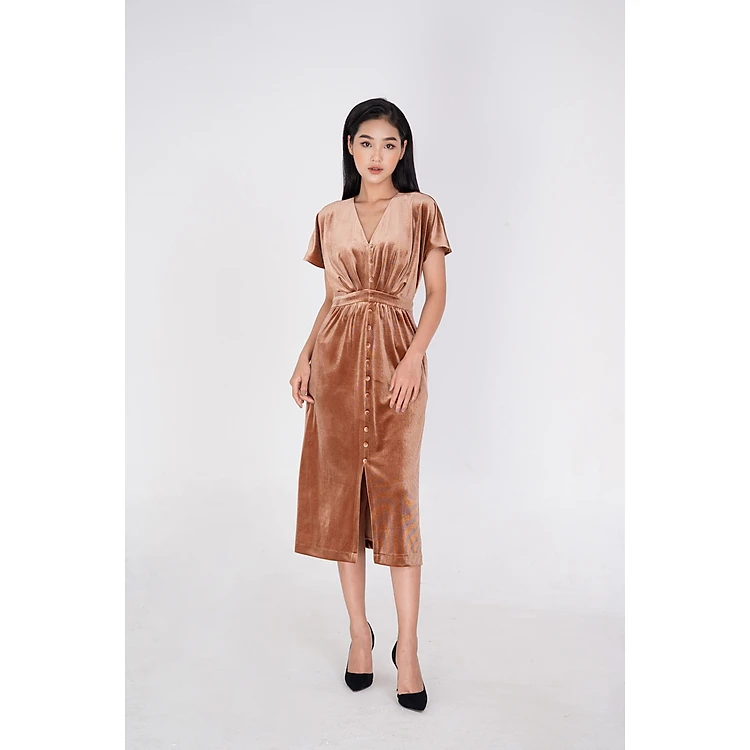 De Leah - Đầm Nhung Xếp Li Cúc Trước - Nâu