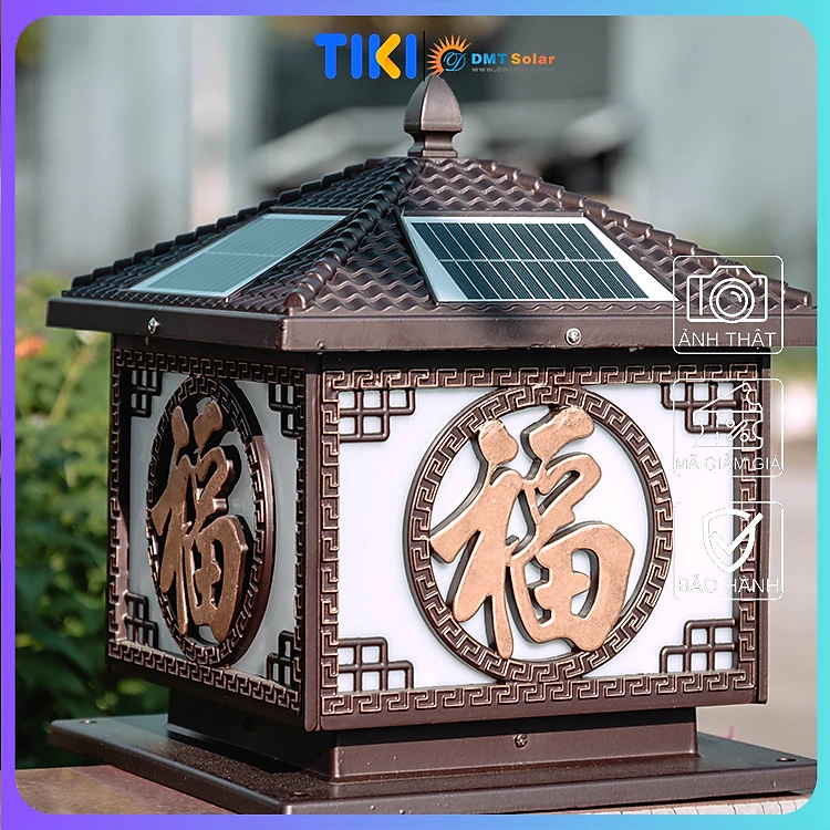 Đèn trụ cổng chữ Phúc năng lượng mặt trời hoa văn tinh xảo mạ vàng kích thước 30*30cm
