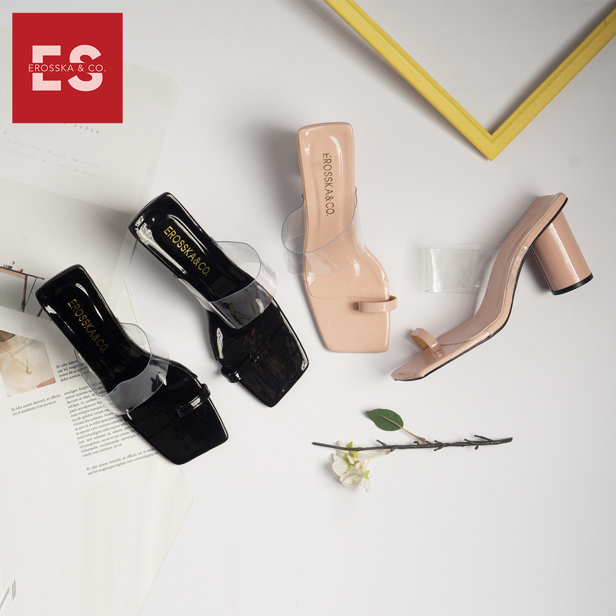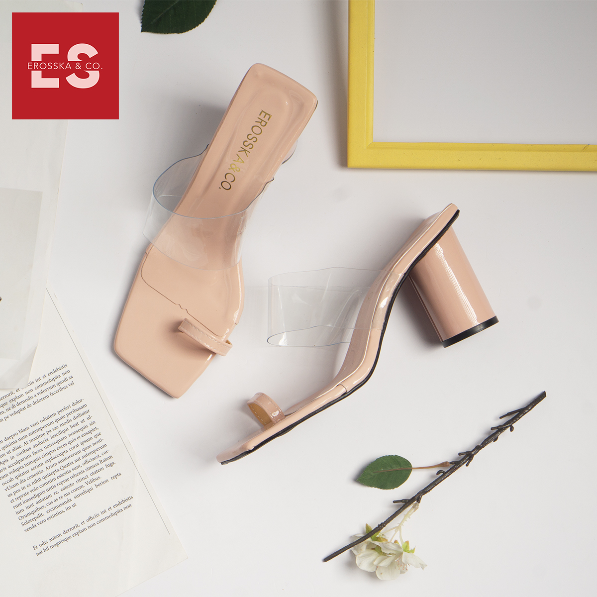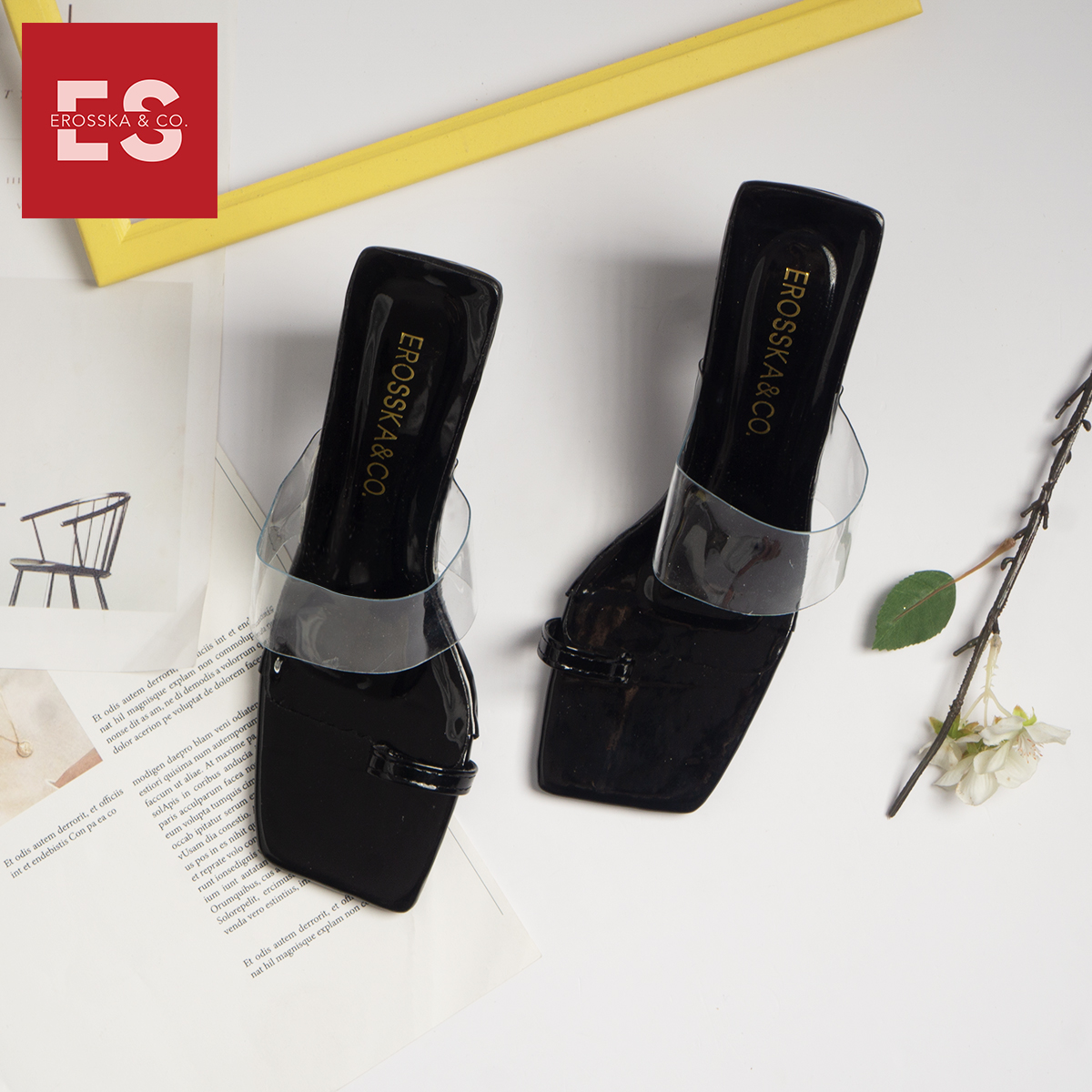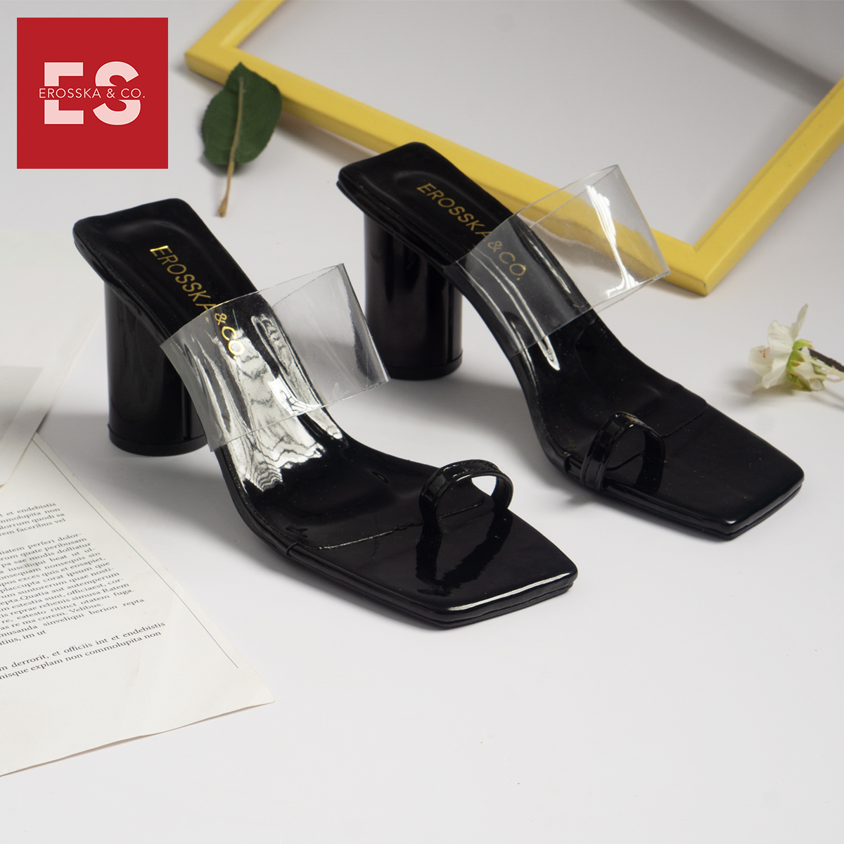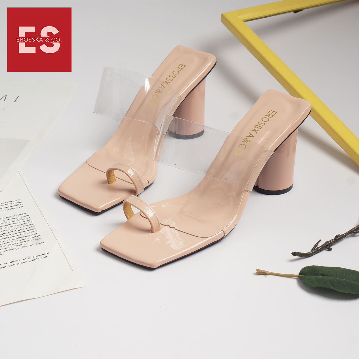 Tên sản phẩm: Dép cao gót Erosska thời trang mũi vuông xỏ ngón phối mica trong cao 9cm EM037