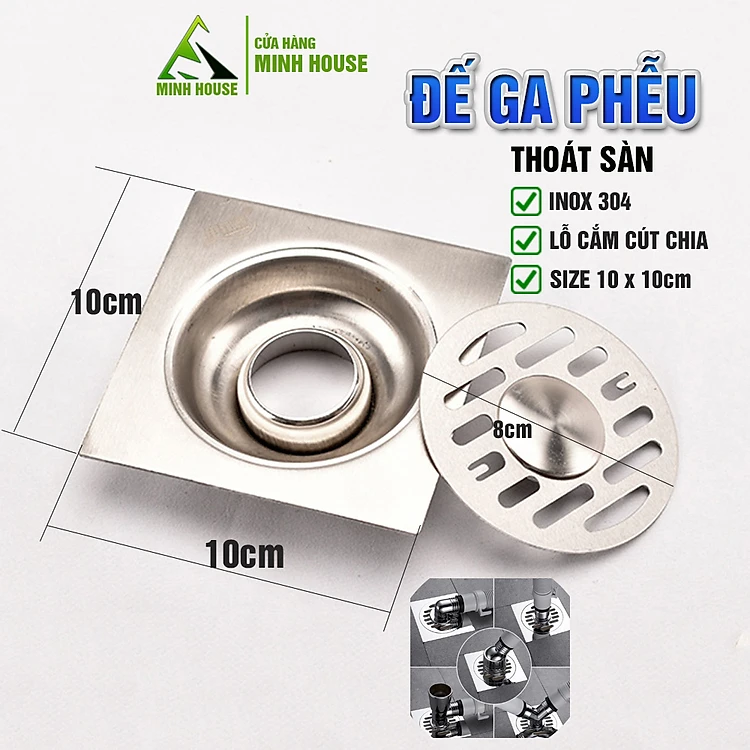 Đế phễu ga thoát sàn Inox có lỗ cắm cổ nối thoát nước máy giặt lắp cut chia thoát nước máy giặt