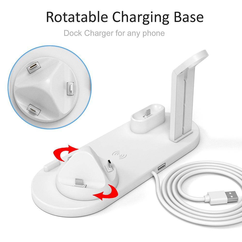 Giá đỡ Bộ sạc đa chức năng với giao diện loại Iphone/Micro/C có thể sạc hầu hết tất cả các thiết bị di động, chẳng hạn như cho iPhone, iPad, Samsung, LG, HTC, Huawei, Sony và Đế sạc được xoay 360 độ.