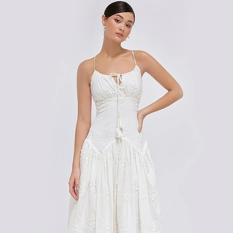 - Đầm midi thêu hoa nhún ngực xẻ giữa thân trước với dây cột hoa vải