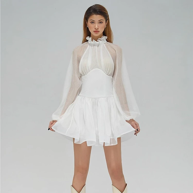 Dear José - Đầm xòe ngắn cổ cao tay phồng dài cột nơ lưng Fly To The Moon trắng