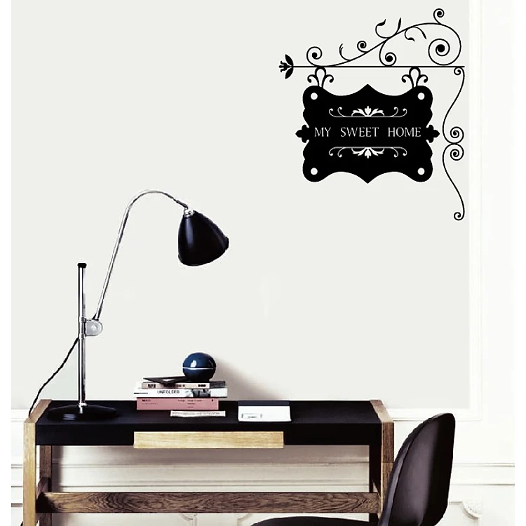 Decal Dán Tường NineWall My sweet home TA005 thuộc nhóm Kí hiệu - Chú ý của Decal Dán Tường NineWall. "My sweet home" là dòng chữ được đặt trên một tấm bảng có trang trí hoa văn cách điệu. Sản phẩm thích hợp cho góc tường hoặc trên cửa của ngôi nhà.