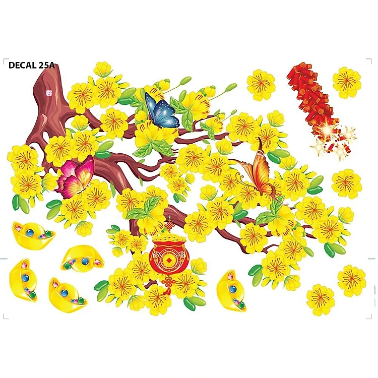 Decal mai vàng hoa đào đón xuân thích hợp trang trí phòng khách, lối cẩu thang có thể kết hợp thêm một số mẫu decal dán tường khác.