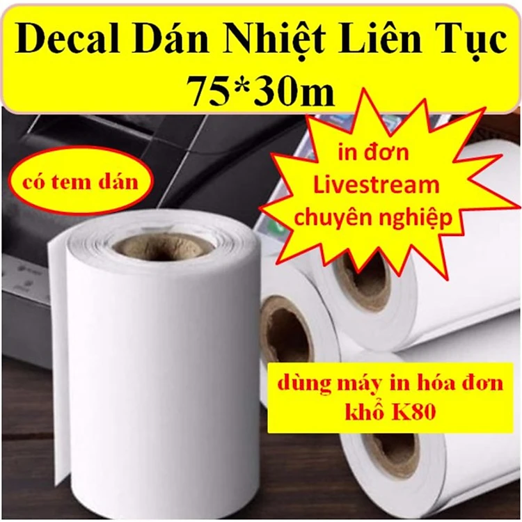 Decal in nhiệt, giấy in nhiệt liên tục size 75 dài 30M dùng in đơn Livestream tương đương khổ giấy K80 - Hàng Chính Hãng