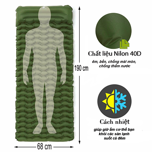 - Độ êm và cách nhiệt tốt: Đệm hơi làm bằng vải Nylon phủ TPU chống nước, sau khi bơm có độ dày lên đến 6.5cm, không bị hấp hơi lạnh từ mặt đất/ nền đất khi ngủ, giúp giấc ngủ ngon hơn