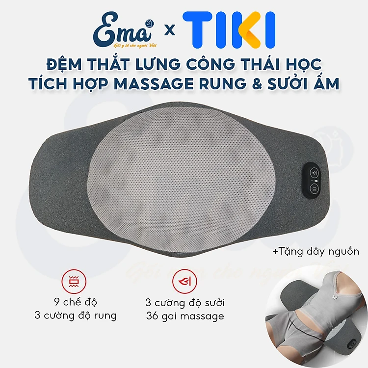 Đệm kê lưng chống thoát vị đĩa đệm EMA tích hợp massage rung & chườm nóng, gối kê lưng giảm đau lưng, tăng tuần hoàn máu