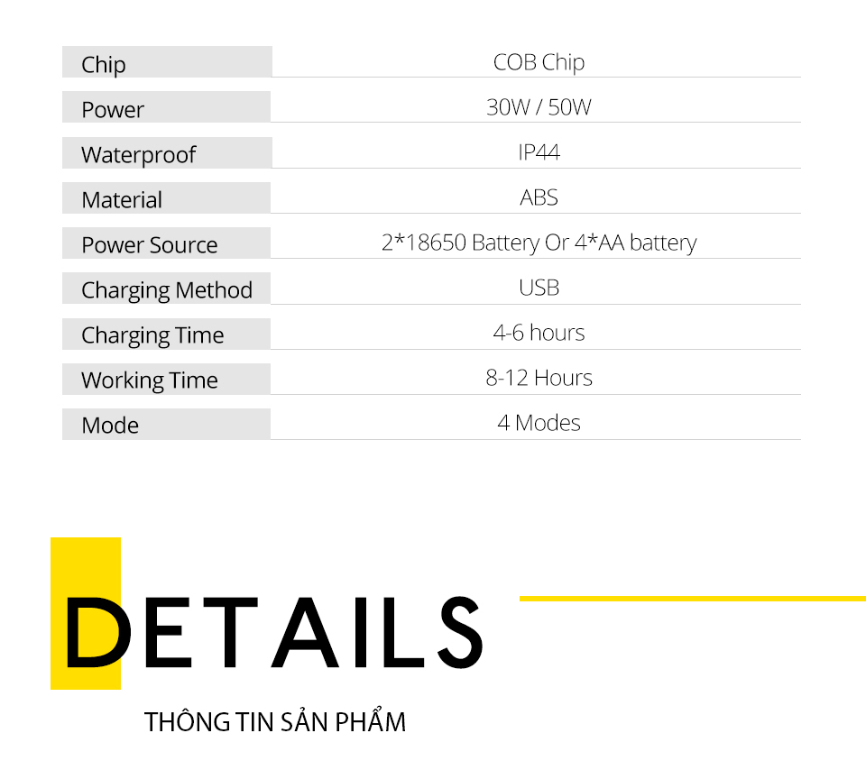 #Cường độ COB : 30W – #Diện tích chiếu sáng <500m – #Cường độ sáng : < 1000LM – #Thời gian chiếu sáng : 2 – 4 h