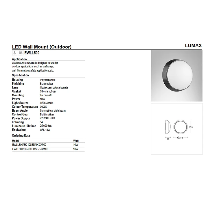 ĐÈN GẮN TƯỜNG NGOÀI TRỜI LUMAX#EWLL 500/BK-10LED/6.5K-XMXD
