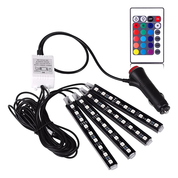 • Sản phẩm gồm: 04 đèn led gầm ghế, 01 bảng mạch điều khiển và dây nguồn, 01 điều khiển từ xa.