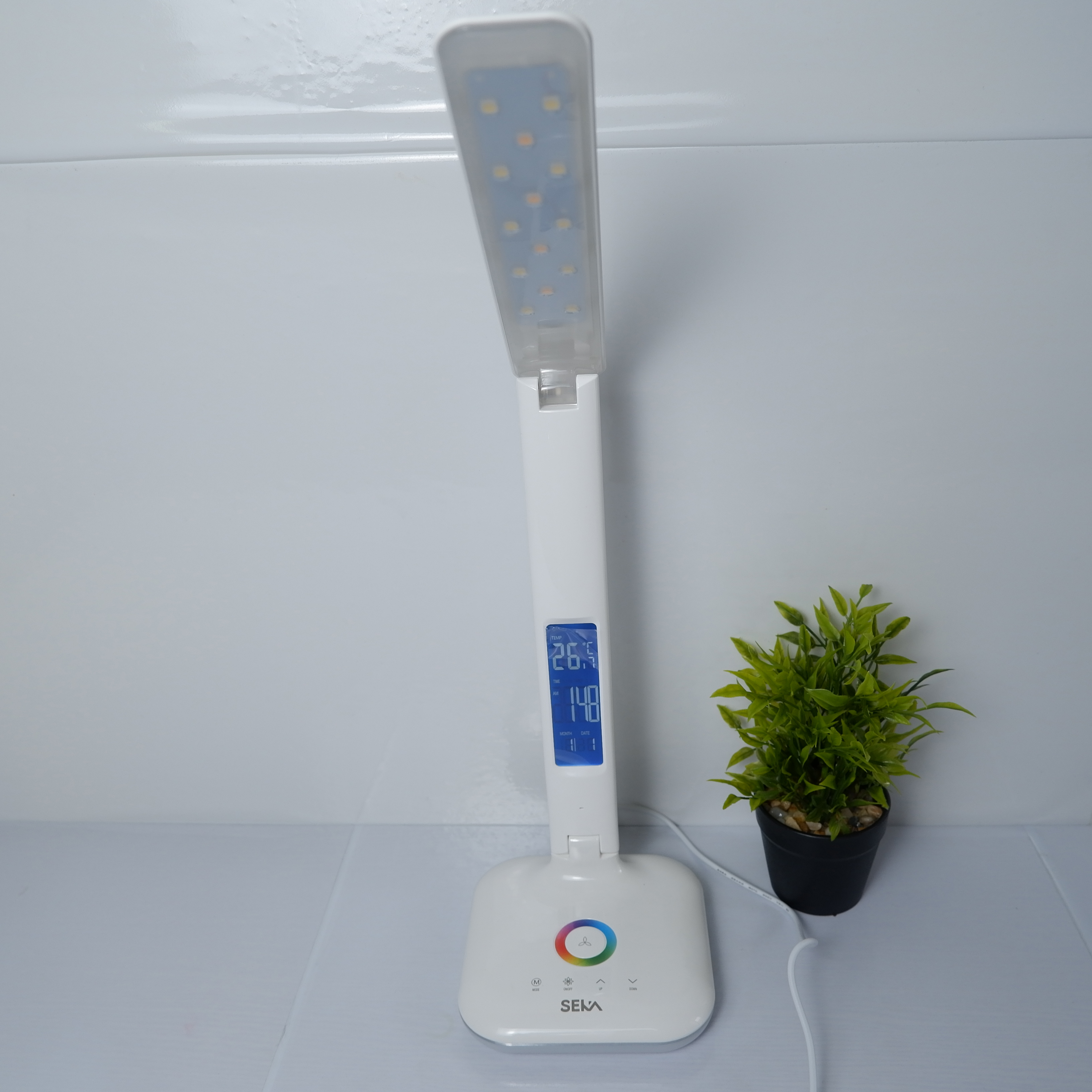 Chiếc đồng hồ ở Đèn LED thông minh chống cận H340 có khả năng theo dõi nhiệt độ môi trường vô cùng thú vị. Giúp thông báo thời gian và ngày tháng. Tất cả đều hiển thị rõ ràng trên thân đèn. Trang bị đồng hồ trên thân đèn ngoài hiển thị giờ giấc chính xác còn có thể sử dụng thay thế cho những chiếc nhiệt kế trong phòng.