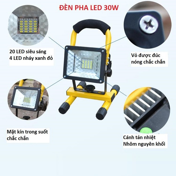 - Đây là sản phẩm đèn pha LED đa năng với thiết kế tay xách có thể mang theo hoặc là sử dụng khi mất điện. Ngoài 20 bóng led siêu sáng, đèn còn được tích hợp thêm 4 bóng led nháy màu xanh, đỏ đẻ báo hiệu khẩn cấp hoặc dùng trong không khí đèn nháy màu sàn nhảy mua hát khi dã ngoại hoặc trong nhà. Với thiết kế đa năng này sản phẩm sẽ phục vụ tối đa mọi nhu cầu chiếu sáng cho người sử dụng ở bất cứ đâu, bất cứ khi nào!